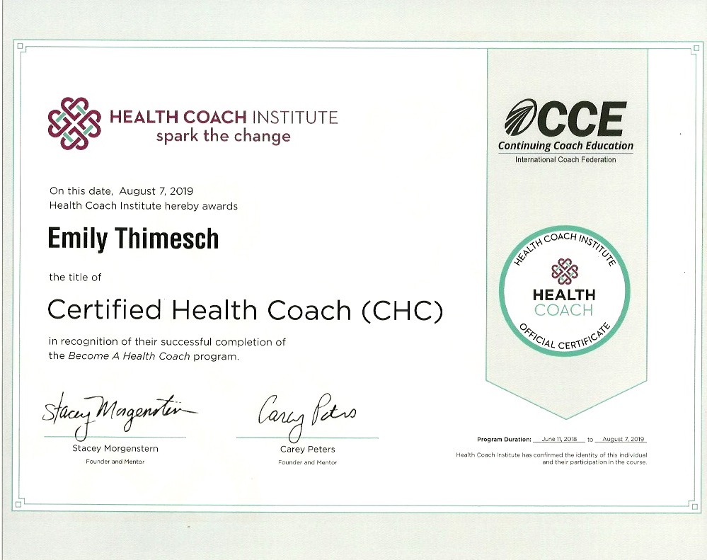 I decided to do a 180 from the counselor route and become a certified health coach. The experience I gained from that education and the jobs to follow quickly turned into a passion. I went on to earn my Master's in Health and Wellness Management, become a Level 1 CrossFit trainer, and become a Certified Mind Body Eating Coach, all of which support the wonderful work I get to do with clients every day.